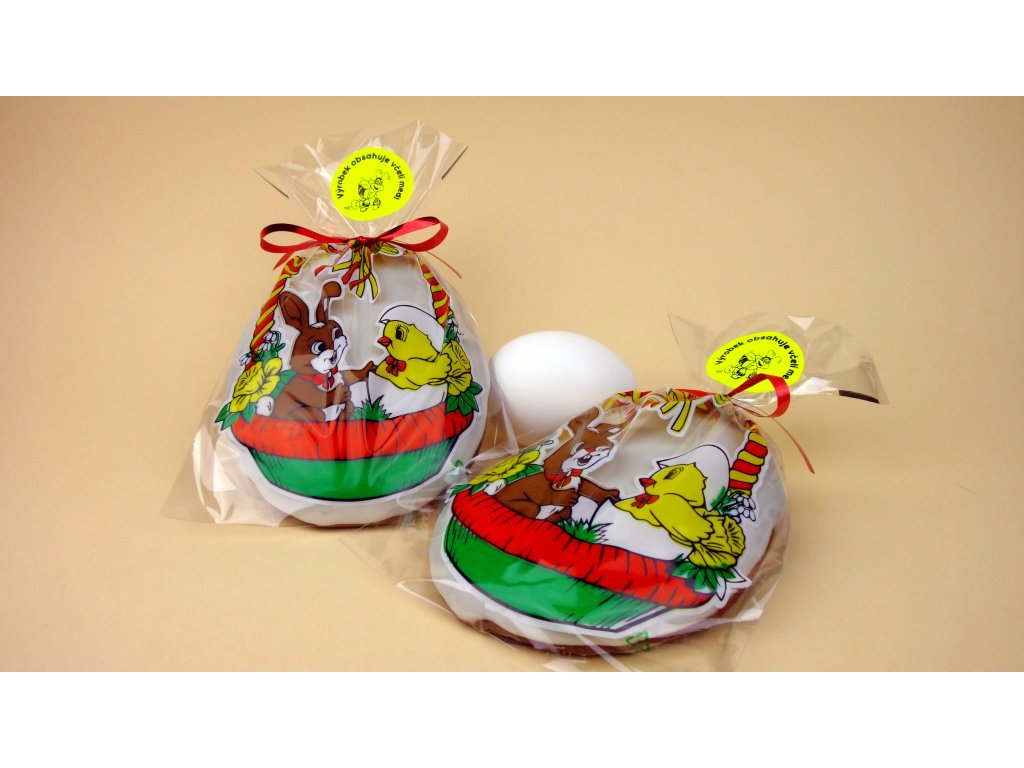 Medový perník s mléčnou měkkou polevou, kvalitní medový korpus jemné konzistence, v průsvitném sáčku, který zdobí tradiční velikonoční obrázek s motivem kuřátka a zajíčka! Velikost perníkového vejce po vytažení z obalu cca 12 x 9 x 2 cm. Ruční řemeslná výroba. Medový výrobek neobsahuje žádná barviva a konzervanty. Výrobek neobsahuje sůl. Medový korpus neobsahuje žádný přidaný tuk. Obsah včelího medu v korpusu 22%. Obal uzavřený stuhou. Na zadní straně obalu etiketa výrobce se složením, datem minimální trvanlivosti, vyznačením možných alergenů. Minimální trvanlivost: 6 měsíců od data výroby. Ruční práce!