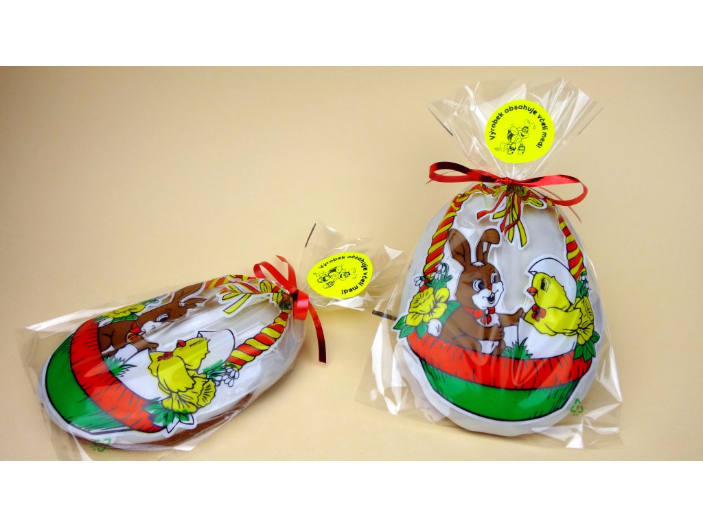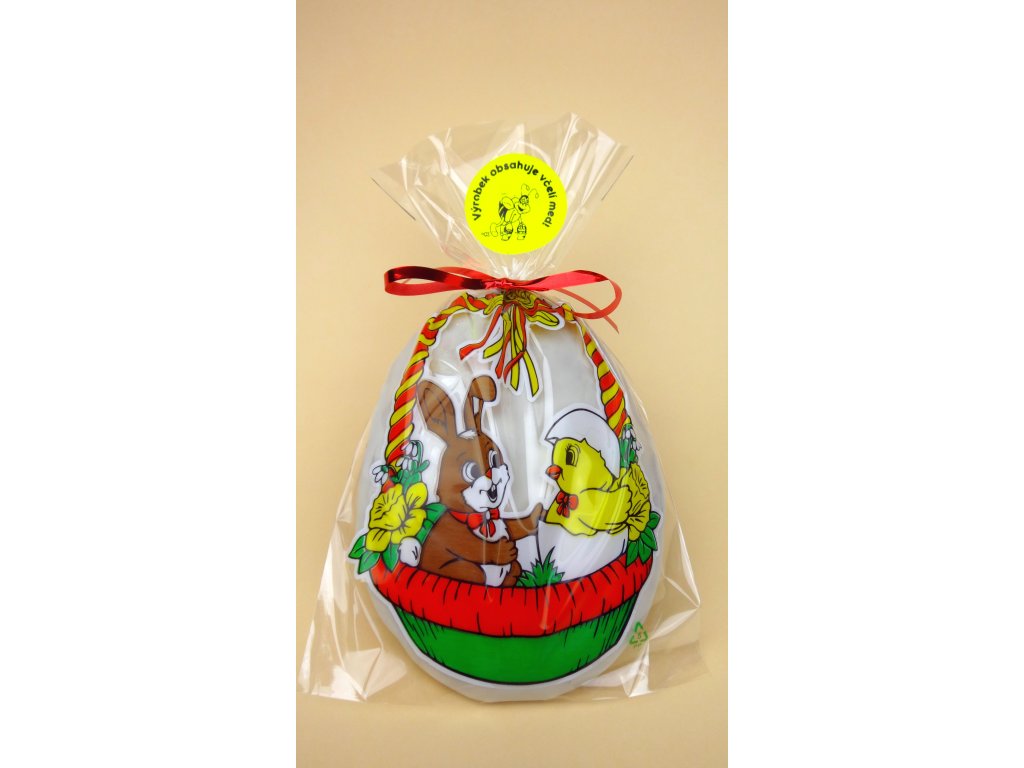 Medový perník s mléčnou měkkou polevou, kvalitní medový korpus jemné konzistence, v průsvitném sáčku, který zdobí tradiční velikonoční obrázek s motivem kuřátka a zajíčka! Velikost perníkového vejce po vytažení z obalu cca 12 x 9 x 2 cm. Ruční řemeslná výroba. Medový výrobek neobsahuje žádná barviva a konzervanty. Výrobek neobsahuje sůl. Medový korpus neobsahuje žádný přidaný tuk. Obsah včelího medu v korpusu 22%. Obal uzavřený stuhou. Na zadní straně obalu etiketa výrobce se složením, datem minimální trvanlivosti, vyznačením možných alergenů. Minimální trvanlivost: 6 měsíců od data výroby. Ruční práce!